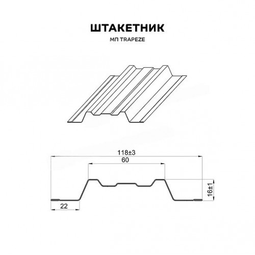 - Код товара: Штакетник металлический МП TRAPEZE-T 16,5х118 0.45мм о-образный